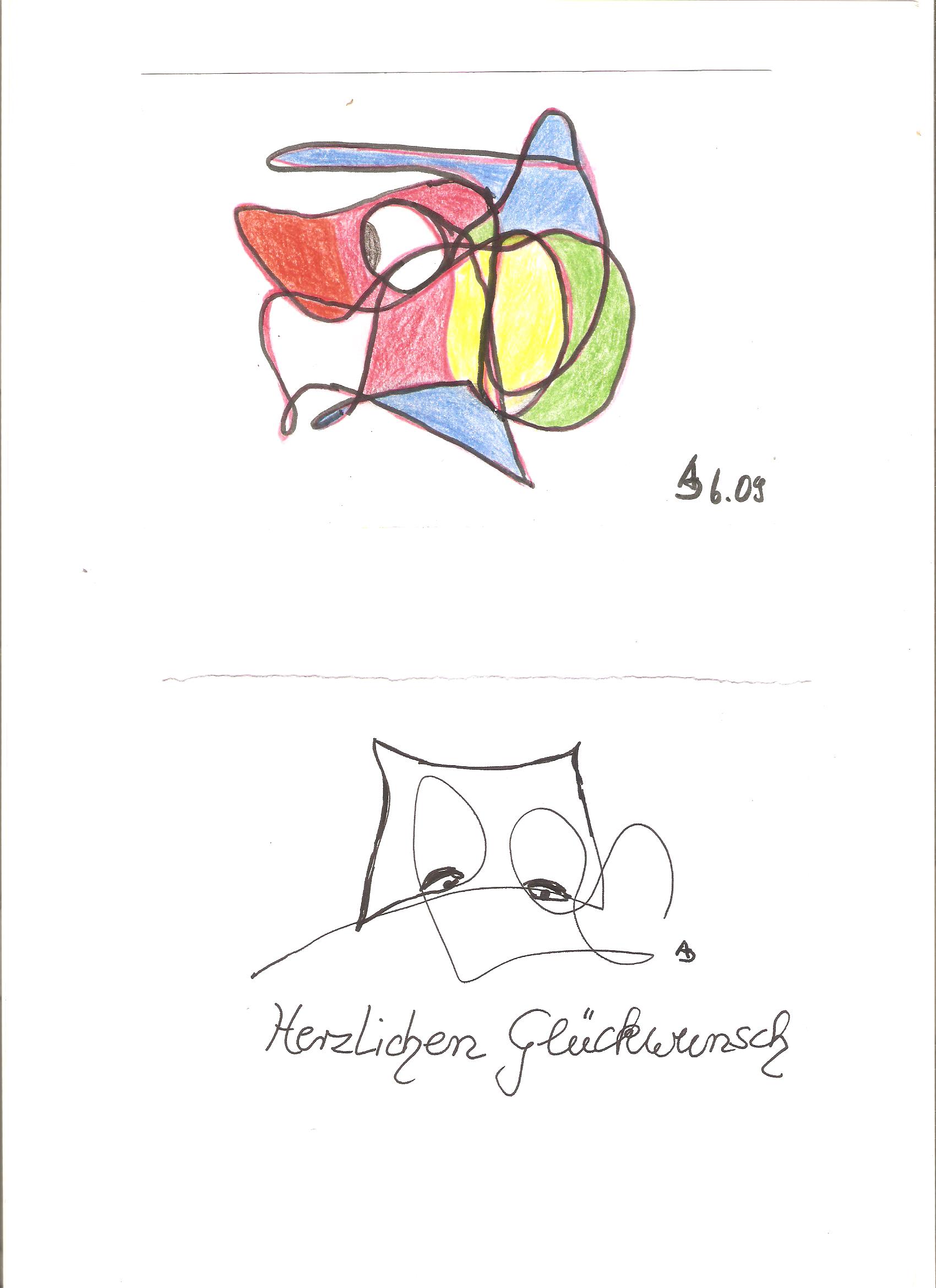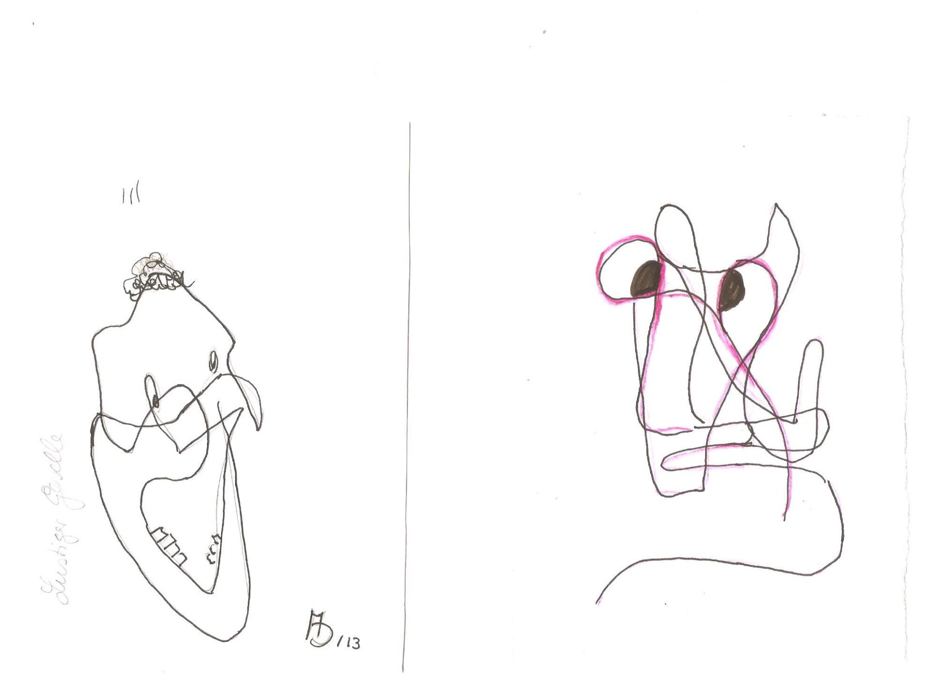 Sie entstehen in dem ich ohne hinzuschauen und absichtslos und ohne abzusetzen eine Linie meist auf ein DIN A 5 Blatt krickele. Anschließend versuche ich ein "Bild" zu erkennen. Dabei drehe ich das Blatt bis ich eins entdecke, meist Gesichter, manchmal Tiere. Diese ergänze ich, um sie "sichtbar" zu machen.
